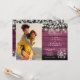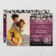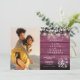 Un faire-part de mariage élégant avec votre photo spéciale et de jolis feuilles de sauge et lilas, des lampes à cordes, des jarres de maçon et vos détails mariages ensemble dans un texte élégant sur un arrière - plan rustique en bois rouge bordeaux. Conçu par Thisisnotme©