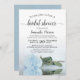 Cette belle invitation à la douche nuptiale présente une photo d'un seul rose bleu clair à long tige, allongé sur son côté, se réfléchissant dans un bassin d'eau avec vagues et ondulations. L'élégant titre de calligraphie script prête classe et style. Inclut des informations sur le registre des douches et des cadeaux. Une façon parfaite de célébrer la mariée à être.