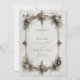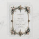 This piece presents a stunningly ornate aesthetic, featuring an intricate three-dimensional frame of sculpted gold filigree. The borders are lavishly adorned with luminous turquoise gemstones and delicate white pearls set into the metalwork. Nestled within the golden scrollwork are soft clusters of dusty pink and powder blue blossoms, accented by fine gold sprigs and tiny jeweled details. The entire arrangement is set against a pale, lightly textured ivory background, creating a vibe of timeless royal opulence and classical luxury. As a wedding invitation, this design serves as a magnificent introduction to a formal fairytale wedding, a grand cathedral ceremony, or a high-end vintage-themed celebration. It offers a majestic first impression that promises an event of incredible detail and sophisticated elegance. This detailed and regal imagery is perfectly suited for those seeking a blend of botanical beauty and jeweler-level craftsmanship.