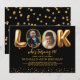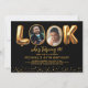 Invitation moderne pour 40 ans avec un fond noir élégant, un design amusant "regardez qui a 40 ans !" avec les deux O remplacés par des photos avant et après, et une bordure scintillante à paillettes dorées en bas. Le modèle de texte facile à personnaliser rend la personnalisation des détails de votre événement simple. Créez l'ambiance pour une célébration sophistiquée avec une touche d'amusement et un affichage photo mémorable. Personnalisez la vôtre et rendez la fête inoubliable.