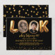 Invitation moderne pour un 60e anniversaire adulte sur fond noir élégant, avec un design amusant "regardez qui va avoir 60 ans !" où les deux O sont remplacés par des photos d'avant et d'après, et une bordure scintillante à paillettes dorées en bas. Le modèle de texte facile à personnaliser permet de simplifier la personnalisation des détails de votre événement. Créez l'ambiance pour une célébration sophistiquée avec une touche d'amusement et une exposition de photos mémorable. Personnalisez la vôtre et rendez la fête inoubliable.