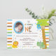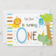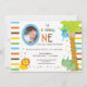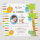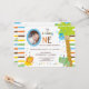 Téléchargez votre propre photo et customisez le texte sur l'adorable invitation de cette adorable photo d'anniversaire. Les rayures Brown, bleues, jaunes, oranges et vertes sont l'accent arrière - plan de ce design animal fantaisiste. Il y a un singe accroché à un arbre, un lion et un éléphant tous vêtus de casquettes colorés d'anniversaire de naissance à un point de polka. Texte : BABYNAME en a fait un". Le "O" en un sert de cadre pour la photo de votre bébé. Il y a beaucoup de texte personnalisable pour que vous puissiez ajouter vos informations de groupe. Le revers de cette conception colorée comporte les mêmes caractères, à l'exclusion du texte de partie.