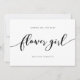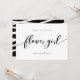 Carte élégante "Seras-tu ma demoiselle d'honneur" avec le mot "fleur" écrit en noir dans une police cursive détendue sur fond blanc. La carte a un verso noir avec des lignes blanches qui se chevauchent.