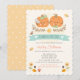 Une invitation à la douche nuptiale à thème, douce et capricieuse, avec une paire de citrouilles mignons tenant la main. La mariée porte un arc en feuilles de pois vert et tient un bouquet de marguerites dans ses mains tandis que son beau marié porte une cravate en feuilles de pois assortie. Acornes, champignon, rouge brun, feuilles jaunes et oranges et bannière d'aqua avec coeurs rendent ce design parfait pour un wedding shower à thème automne et automne. Oeuvre "Merci pour l'amour" © Chrissy H. Studios, LLC. Tous droits réservés.