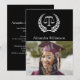 Feuille de laurier noir et blanc avec des écailles de justice en silhouette. Fond noir. Personnalisez cet objet de remise de diplôme avec la faculté de droit, la profession juridique telle qu'avocat, avocat, paralégal, collège ou université et votre nom et titre ainsi que les informations de cérémonie de remise de diplômes ou de fête d'open house.