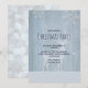 Une invitation à une fête de Noël avec un fond en faux bois ton bleu. Superposé sur le dessus est une silhouette d'un renne avec de grosses bois et quelques jolies illustrations de flocons de neige tombant autour de lui.