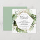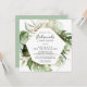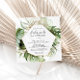 Cette invitation de repas de demoiselles d'honneur geometric gold green est parfaite pour une fête prénuptiale de mariage de destination. Le design présente des feuilles de palmier et de bananier peintes à la main avec de l'aquarelle dorée et verte avec des fleurs roses regroupées en bouquets, ornant un cadre géométrique.