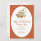 Une invitation à un repas de Thanksgiving conçue avec des feuilles colorées d'automne et une citrouille à l'aquarelle, sur un fond orange vif et blanc avec le texte de l'invitation : date, heure et détails de réponse. Le verso est de couleur orange récolte assortie. Pour personnaliser, remplacez simplement le texte d'exemple en utilisant notre modèle étape par étape.