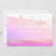 Une invitation baby shower rose montrant une maman et un bébé requin. Les deux sont roses et flottent dans un océan rose. Le texte est entièrement personnalisable. Le dos de l'invitation a un motif de requin.