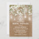 Cartons d'invitation de mariage de campagne avec lumières scintillantes avec un fond effet toile de jute marron rustique, gupe de lumières de jarre de maçon élégantes, fleurs de respiration de bébé et un modèle de cortège nuptial moderne.