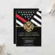 Cette conception présente un drapeau de sapeurs-pompiers avec des bandes noires et blanches, ainsi qu'une fine bande rouge. "Félicitations" et un badge de sapeur-pompier sont au-dessus de tous les détails de la fête pour la retraite du sapeur-pompier, du lieutenant ou du chef. Les invitations peuvent également être personnalisées pour un diplômé de l'académie de sapeurs-pompiers.