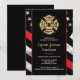 Ce design présente un drapeau de pompiers avec des bandes noires et blanches, ainsi qu'une fine bande rouge. Un badge de pompier est situé au-dessus de tous les détails de la fête pour la soirée de retraite du pompier, lieutenant ou chef qui part à la retraite.