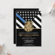 Ce design présente un drapeau de la force de police avec des bandes noires et blanches, ainsi qu'une fine bande bleue. Le badge de police et le texte doré se trouvent au-dessus de tous les détails de la fête pour la retraite de l'agent de la force publique, du shérif, du capitaine ou du chef, les détails de la fête de retraite.