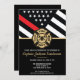 Cette conception présente un drapeau de pompiers avec des bandes noires et blanches, ainsi qu'une fine bande rouge. "Félicitations" et un badge de pompier sont au-dessus de tous les détails de la fête pour la soirée de retraite du pompier, lieutenant ou chef qui part à la retraite. Les invitations peuvent également être personnalisées pour un diplômé de l'académie de pompiers.