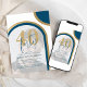 Ces invitations minimalistes rétro pour 40e anniversaire sont parfaites pour une célébration d'anniversaire. Les invitations présentent un thème rétro avec des nuances de bleu et d'or. Un modèle d'invitation de fête d'anniversaire moderne sur votre photo encadrée d'arches dans des tons bleus et or modernes. Les styles de police et la couleur peuvent être modifiés en cliquant sur le lien de personnalisation supplémentaire après la personnalisation.