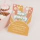deux Invitation de premier anniversaire Groovy Retro Sunshine inspirée avec des marguerites et des polices et des couleurs des années 70.