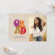 Cette amusante invitation à la remise des diplômes a une conception moderne des années 1970 vintage. L'avant de la carte comprend les années 70 lettrage à gauche et une photo verticale à droite. La typographie rétro dit "Grad" dans les tons de brumes violettes, d'orange vif, d'or récolté et de rouge cerise contre un arrière - plan bronzé. Le nom et l'école du diplômé sont écrits sous la typographie, et l'année de graduation est écrite à travers le D dans "Grad". Au fond, il y a un modèle pour les détails de la fête de remise des diplômes.