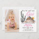 Retro Side Photo Western How The West Was One 1st Birthday Invitation Une jolie fille sur le thème occidental de l'invitation de premier anniversaire comprenant un paysage de désert de cactus, un mot de style corde, un fer à cheval dessiné à la main, et une photo sur le côté. Cette invitation de 1er anniversaire de jeune fille d'ouest sauvage comporte également une photo et un texte sur le dos et est idéale pour une fête de premier anniversaire à thème occidental.