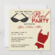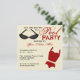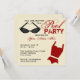 Une invitation rétro inspirée à la piscine avec une illustration d'une paire de lunettes noires en haut à gauche et d'un maillot de bain rouge foncé en deux pièces en bas à droite. Personnalisez le texte rouge et noir avec les détails de votre occasion.