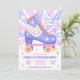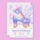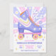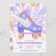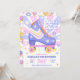 Un design ludique et rétro inspiré du roller dans la palette de couleurs rose pastel, orange, violet et jaune. Sur le devant se trouve un roller violet et le texte "Let's Roll" dans un script rétro avec un soleil éclaté derrière, et sur le dos est un motif ludique et lumineux de patins à rouleaux. Customisez les détails de votre fête ! Voir l'ensemble de la collection de fêtes de correspondance.