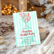 Invite your guests in style with this fun and festive Christmas cocktail party invitation, featuring a retro Santa illustration sitting inside a martini glass with a minimalist mint striped background. The mix of playful red typography and watercolor pastel stripes gives this design a modern vintage feel.