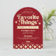 Célébrez Noël dans le style avec ces invitations super rétro "choses préférées" fête de vacances. Le libellé modèle est facile à personnaliser avec les détails de votre fête de vacances, y compris des instructions pour vos invités sur le nombre de cadeaux à apporter et leur valeur estimée. Les articles de vacances correspondants se trouvent dans la collection.