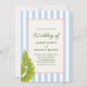 Celebrate your special day with a playful retro tropical vibe! This wedding invitation features a soft blue striped background, palm fronds, and a rope-bordered frame with green text. Perfect for couples who love whimsical elegance with a touch of island flair.