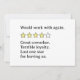 Cette analyse franche met en évidence le travail d’équipe et l’esprit de collaboration d’un collègue et souligne qu’il serait bon de les accueillir dans le cadre de projets futurs. Cependant, il critique leur manque de loyauté perçu, soulignant la déception sur leur départ. La réduction d'une étoile reflète l'impact émotionnel de leur sortie plutôt que leur performance professionnelle. Idéal pour les discussions sur la dynamique du milieu de travail, le maintien en poste des employés ou l'équilibre entre les relations personnelles et professionnelles. Le ton est informel mais révélateur, offrant des aperçus sur la façon dont les collègues valorisent la fiabilité et la camaraderie dans les espaces de travail partagés.