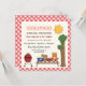 BBQ cuisine de la famille invitation annuelle de réunion avec en vichy rouge ou bordure vichy avec une table whimsical avec à damiers nappe et hamburgers, salade de pommes de terre, pastèque et jus d'orange sur elle, un barbecue au gaz rouge, un arbre et le soleil. Idéal pour un pique-nique d'été. Éléments d'art d'Alice Smith.