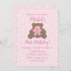 Un joli ruban rose fille en peluche d'ours bébé première invitation fête d'anniversaire. L'Arrière - plan est motif pois, rose pastel et blanc.