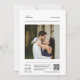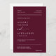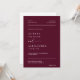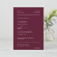 Cette élégante faire-part de mariage minimaliste moderne allie une police serif épurée à de belles calligraphies de script pour les mots "et" et "réponse", lui donnant un look intemporel et sophistiqué sur un arrière - plan bordeaux. Le design comprend une photo personnalisée du couple et un code QR qui dirige les invités vers RSVP et accéder aux détails de l'événement, ce qui en fait une combinaison parfaite de style et de commodité. Devenez écolo avec cette invitation tout-en-un écologique en réduisant le besoin de RSVP et de cartes de détails supplémentaires. Il vous suffit d'ajouter votre code QR au verso de l'invitation et de partager les informations essentielles sur le mariage numériquement. Customisez les noms et le libellé en quelques étapes simples et personnalisez l'invitation avec votre propre photo pour une touche unique et significative. Remarque : La belle écriture des mots "et" et "réponse" ainsi que les lignes sur l'avant et l'arrière et d'autres éléments d'illustration graphique ne peuvent pas être modifiés, déplacés, ou supprimés, Ils sont corrigés. Si vous souhaitez changer de couleur, vous pouvez facilement customiser l’invitation à correspondre à votre thème mariage en cliquant sur "Customiser l’invitation". Vous pouvez personnaliser cette invitation avec votre texte et la partager numériquement par texte, e-mail ou médias sociaux. Vous préférez une touche traditionnelle ? Vous avez également la possibilité d'envoyer une version imprimée à vos invités, ou de faire les deux pour plus de commodité!