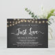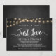 Magnifique carte d'annonce / invitation de mariage intime 'Rien de fantaisiste, juste l'amour', sur fond de tableau noir à la craie de ferme rustique, avec guirlandes lumineuses. C'est parfait pour votre réception de mariage et fête de célébration après le mariage. Ajoutez vos détails dans la même police / lettrage.
