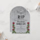 Tournez 40 dans l'élégance sombre et élégante avec cette Rip Single Life Gothic Gravestone Bachelorette Party Invitation! Cette invitation en forme d'arc ressemble à une pierre de tête, avec un crâne avec emblème d'ailes, des roses, des épines et une texture de pierre gris aquarelle.