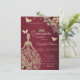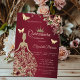 Couronne de paillettes dorées, robe, papillons et fleurs sur fond rouge. Invitez vos invités à se joindre à vous pour célébrer cette étape importante avec un design qui reflète la magie et la joie de votre quinceañera.