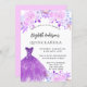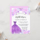 Une invitation moderne, élégante et glamour pour une Quinceañera, 15ème anniversaire. Un arrière - plan blanc aux fleurs roses rousses, une robe violette. Le nom est écrit avec un script de style moderne écrit à la main. Personnalisez et ajoutez les détails de votre fête.