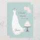 Robe, gâteau et fleurs blancs élégants de mariage à une invitation cyan faible pâle de Fête de la mariée d'arrière - plan de damassé (d'aigue-marine pâle)