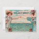 Amour à la plage ! Cette image vintage est basée sur une carte postale antique avec un homme et une femme tendant les bras pour se toucher les mains
