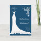 Robe de mariée blanche et fleur en fleurs sur fond bleu, carte de demande de demoiselle d'honneur.. Vous pouvez ajuster le texte selon vos besoins.