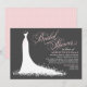 Une invitation d'enterrement de vie de jeune fille intemporelle associant un fond charbon profond avec une robe de mariée blanche élégante ornée de motifs floraux et de papillons. La calligraphie rose pastel claire donne un air de douceur aérienne au design sophistiqué. Le verso présente un motif de papillon rose pâle coordonné. Tout le texte est entièrement modifiable pour votre célébration.