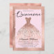 Invitation de Quinceañera élégante en feuille d'or rose et paillettes, représentant une robe en or rose et un cadre en or rose avec des éléments scintillants. Personnalisez avec les détails de la fête en lettrage majuscule tendance.