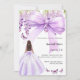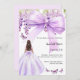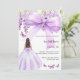 Un élégant arrière - plan blanc, décoré d'une grande lavande, d'un arc de couleur violet, de fleurs de glycine, de papillons et d'une fille en robe. Personnalisez et ajoutez un nom et des détails du parti.