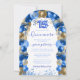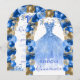 Cette élégante invitation de Quinceañera présente une parties scintillant brillante en bleu doux entourée d'un arc de ballons dans différentes nuances de bleu, et d'or. Des banderoles et des confettis en bleu et or complètent l'ambiance du parti. Ajoutez le nom et l'âge à personnaliser. L'arrière comprend une arche à ballon, des serpentins, des confettis et du texte personnalisable pour les détails de votre fête.