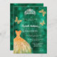 Une invitation moderne, élégante et glamour pour une Quinceañera, 15ème anniversaire. Un arrière - plan vert émeraude clouté avec un faux or une robe, un faux tiare d'argent et des papillons d'or. Le nom est écrit avec un script de style moderne écrit à la main. Personnalisez et ajoutez les détails de votre fête.