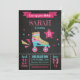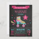 Cette invitation comporte un patin à roulettes rose et turquoise pour un anniversaire rétro de patinage à roulettes. Accents de parties scintillant d'or et polices calcaires.