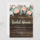 Ces invitations à la douche nuptiale rustique et tendance présentent des fleurs d'aquarelle et des feuilles dans des tons doux de rose roux, pêche, blanc et bleu, avec un accent moderne de points faux or, sur un arrière - plan en bois marron.