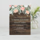 Ces invitations de mariage rustiques et tendance présentent des fleurs d'aquarelle et des feuilles dans des tons doux de rose roux, pêche, blanc et bleu, avec un accent moderne de points d'or faux, sur un arrière - plan en bois marron.