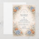 This romantic wedding design features soft blue and peach florals arranged in a delicate garden composition. Inspired by wildflowers and classic botanical illustrations, the artwork blends muted neutrals with airy florals for a timeless, refined look. The elegant layout and gentle color palette make it ideal for couples planning a nature-inspired wedding with a graceful, understated aesthetic that feels both modern and enduring.