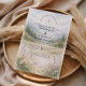 A serene and atmospheric design inspired by misty mountain landscapes and quiet forest scenery. Soft watercolor layers of pine trees and distant hills fade gently into the background, creating depth and a calm, romantic mood. The muted palette of sage green, cool grey, and soft ivory gives the design a refined, nature-driven elegance—perfect for couples drawn to minimalist aesthetics and intimate outdoor celebrations.