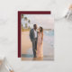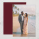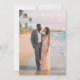 This wedding invitation features a romantic beach scene with a couple standing close together, capturing an intimate moment. The design uses soft pastel colors like light pink and beige for the dress, contrasted against a muted gray suit, creating a serene and elegant atmosphere. The photographic style emphasizes realism, highlighting details of the ocean waves and sandy shore under a warm gradient sky. Perfect for couples seeking a tranquil and affectionate theme, this invitation evokes feelings of love and tranquility in a picturesque setting.