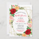 This fun and whimsical bridal shower invitation features watercolor red, pink and orange roses with foliage on a gold geometric frame. The text combines handwritten script and serif fonts for a stylish and modern look. This is perfect for a spring or summer rustic bridal shower.